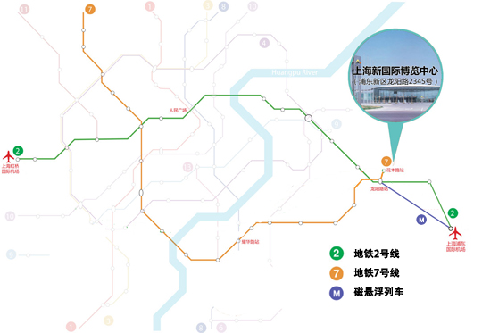 ? ?上海新國際博覽中心戰(zhàn)略性地坐落于浦東經(jīng)濟開發(fā)區(qū),距離上海新國際博覽中心600米處有一大型交通樞紐站,即龍陽路站(位于龍陽路上),包括多條路公交線路起點站、軌道交通2號線龍陽路站、軌道交通7號線龍陽路站以及磁懸浮列車終點站。從2號線龍陽路站步行到展館大約需10分鐘;從7號線花木路站步行到展館大約1分鐘。