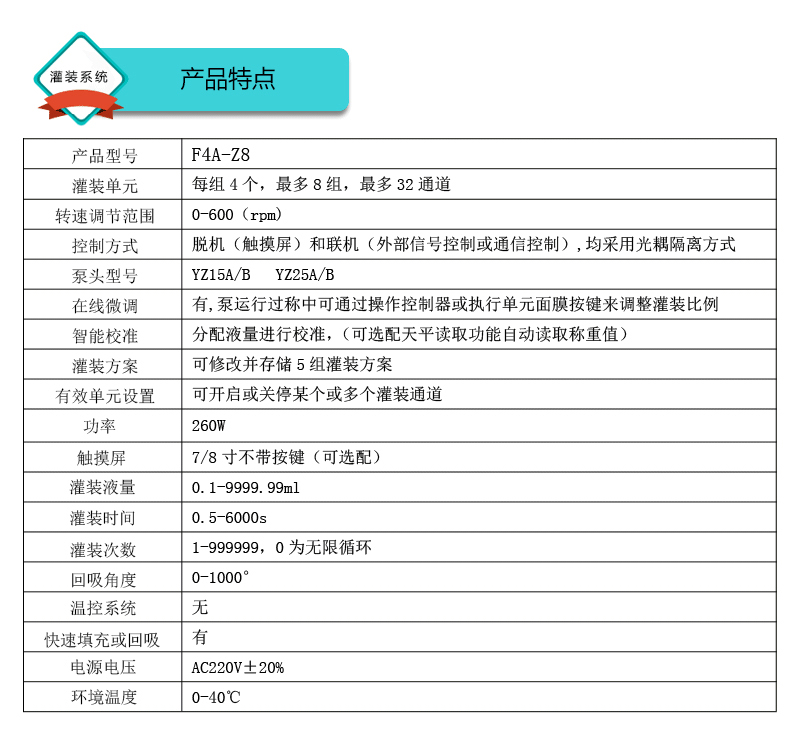 1.灌裝系統(tǒng)由4組基本通道(可擴(kuò)展至32通道),一臺控制器組成,可安裝YZ15、YZ25泵頭