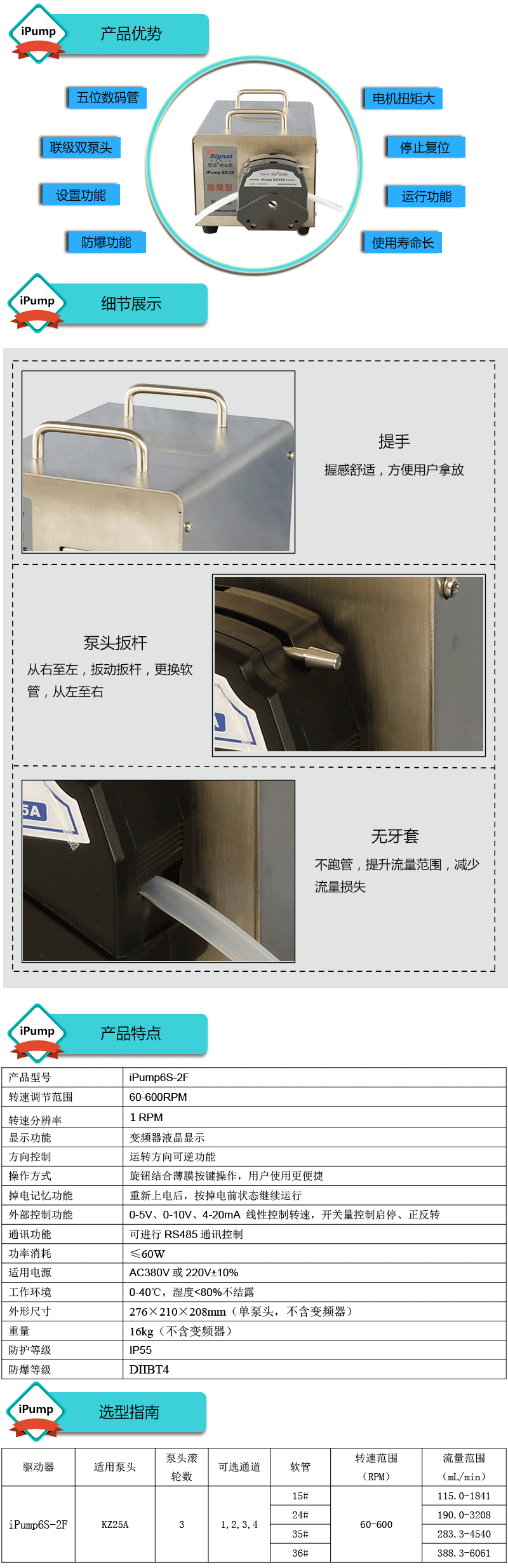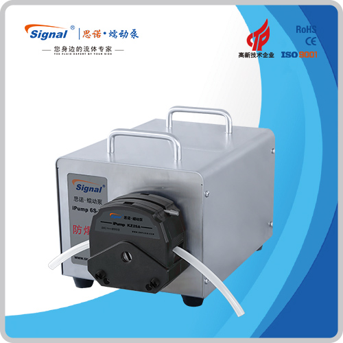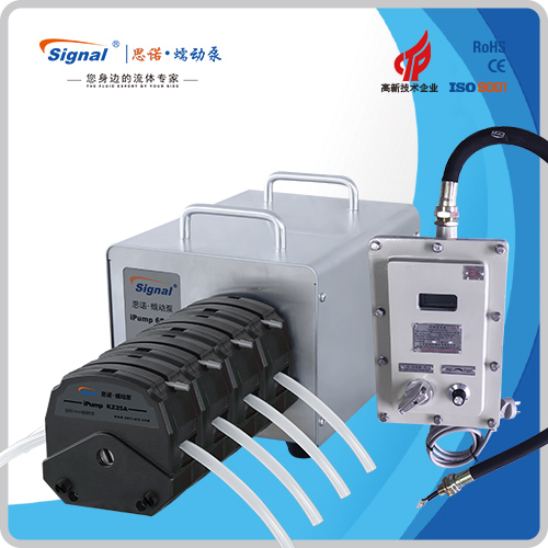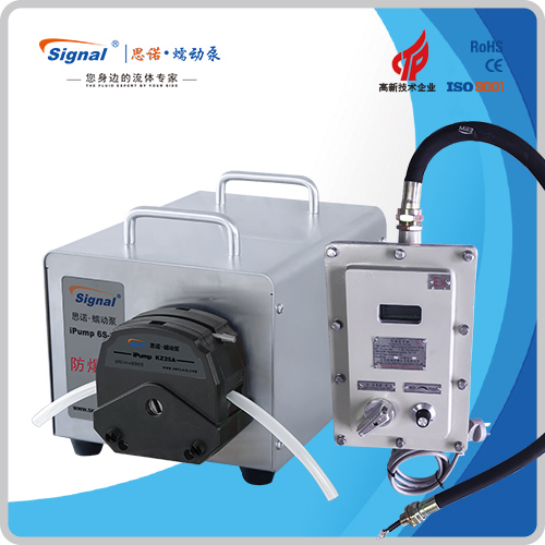 1.流量范圍:115.0-6061mL/min 2.免維護交流防爆減速電機驅動,變頻器調節轉速 3.電機扭矩大,可級聯雙泵頭 4.防爆等級DIIBT4,適合易燃易爆環境使用 5.304不銹鋼外殼,易擦拭,耐腐蝕,便于攜帶