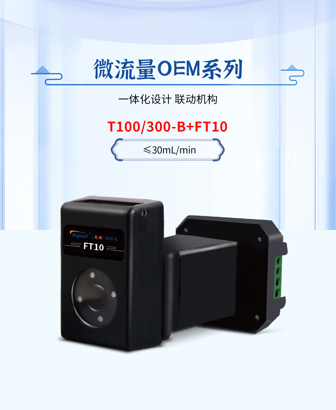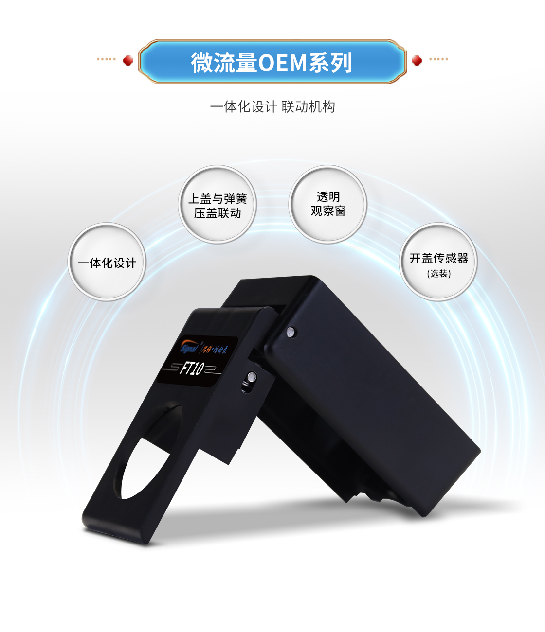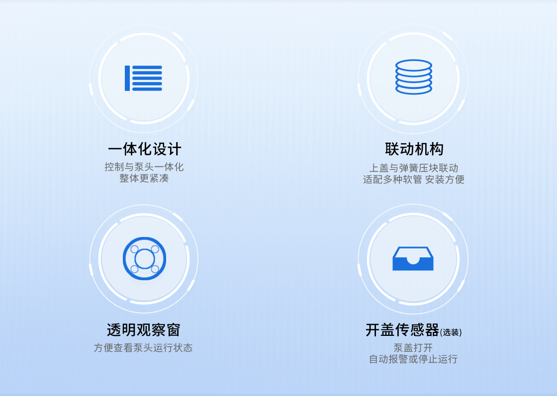 1.流量范圍:<30mL/min 2.控制與泵頭一體化設計,整體更加緊湊 3.上蓋與壓塊聯動機構,安裝軟管更方便 4.彈管壓塊,可適配多種軟管 5.步進電機驅動 6.透明觀察窗可方便查看泵頭運行狀態 7.開蓋傳感器(選裝):泵蓋打開,自動報警或:停止運行
